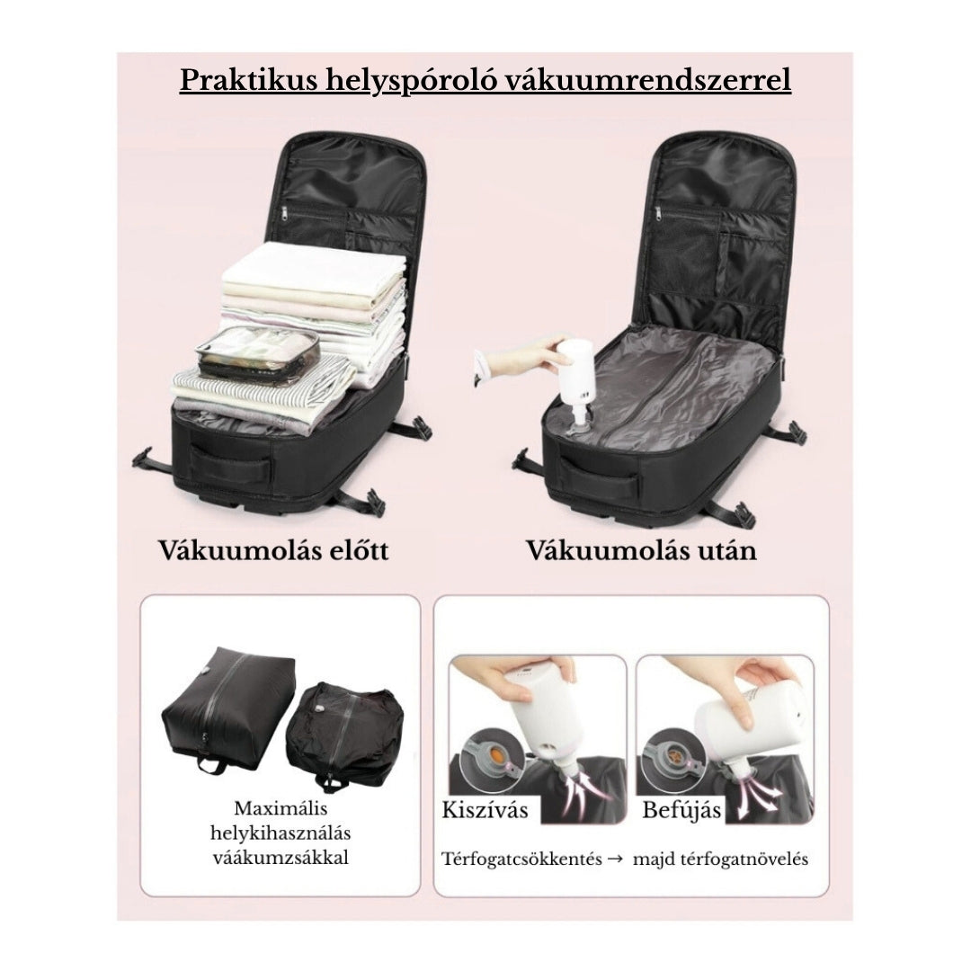 Könnyű, mégis masszív szerkezete, vízlepergető Oxford anyaga és kényelmes vállpántjai miatt bárhová magaddal viheted – munkába, edzésre vagy hétvégi feltöltődésre. A vákuumkompressziós rendszer és az ajándék vákuumzsák + pumpa segítségével pillanatok alatt akár 50%-kal több helyet nyerhetsz, így semmit nem kell otthon hagynod.